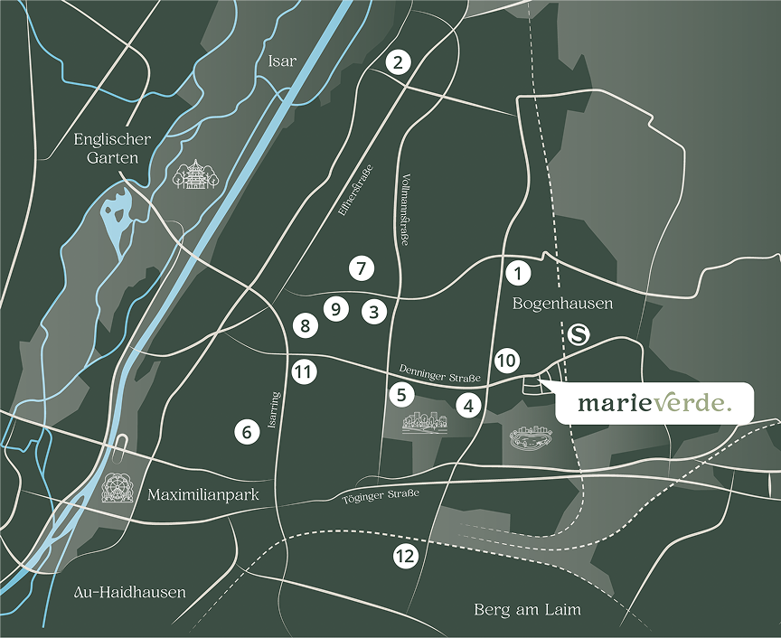 »marieverde« befindet sich in einer der begehrtesten Wohnlagen Münchens – ruhig, grün und gleichzeitig bestens angebunden. Umgeben von Parks, weitläufigen Naherholungsgebieten und der Isar bietet die Lage einen direkten Zugang zu Natur und Erholung, ohne auf urbanes Leben verzichten zu müssen.