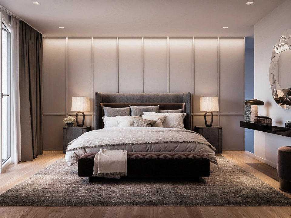 Auch die Bäder folgen diesem Anspruch mit einer klaren Formensprache und einer sorgfältig abgestimmten Materialität. Fein nuancierte Farbwelten, präzise ausgearbeitete Details und großzügige Raumaufteilungen verleihen ihnen eine moderne, ruhige Ausstrahlung. So entstehen Rückzugsorte, in denen sich Design und Funktion auf selbstverständliche Weise verbinden und Stil, Komfort sowie Wertigkeit spürbar erlebbar werden.